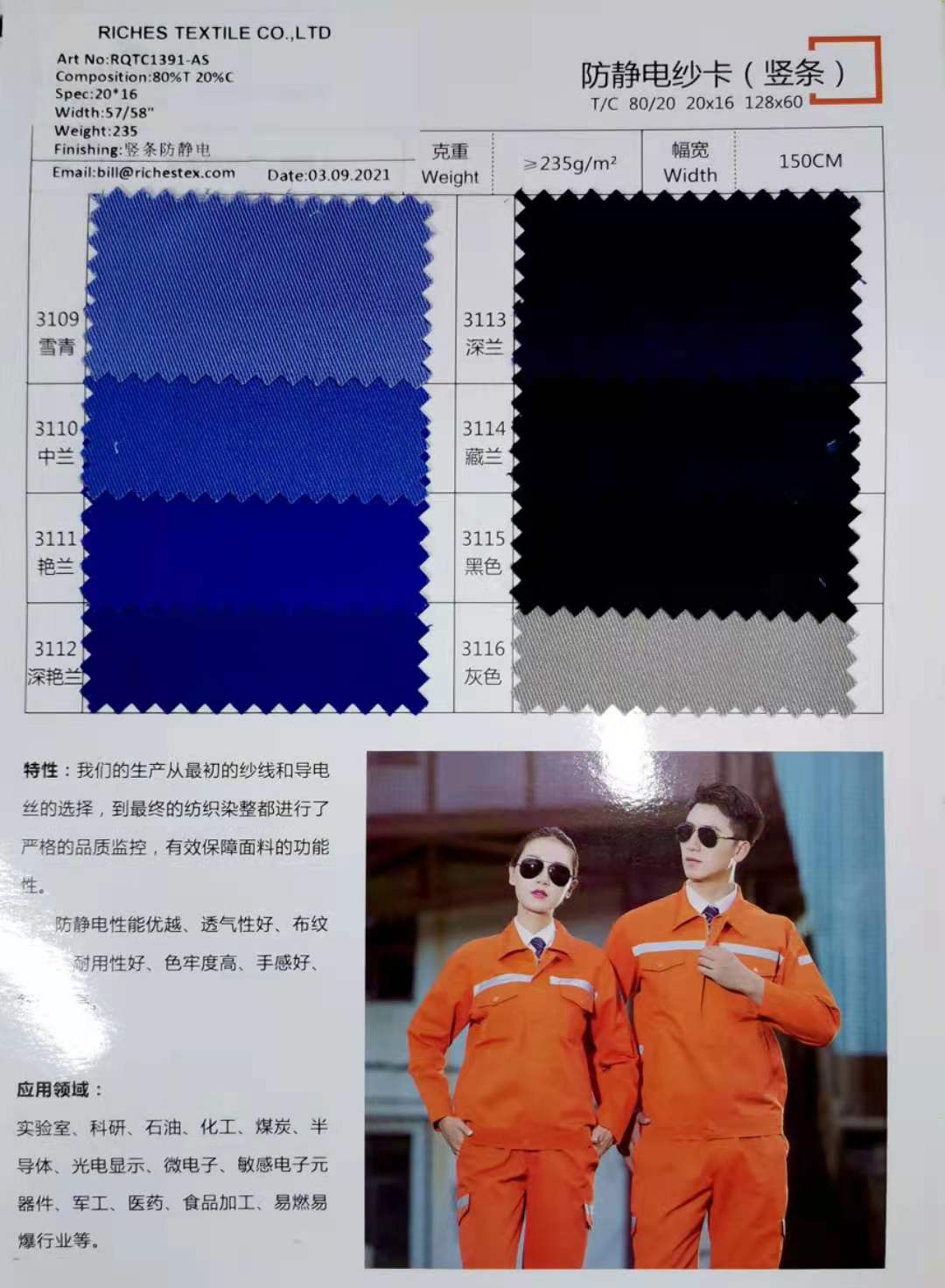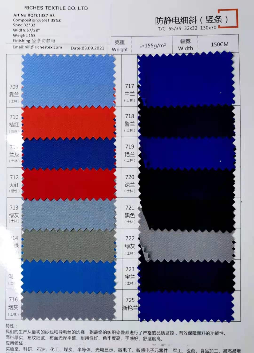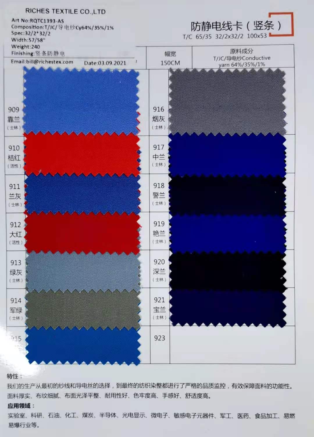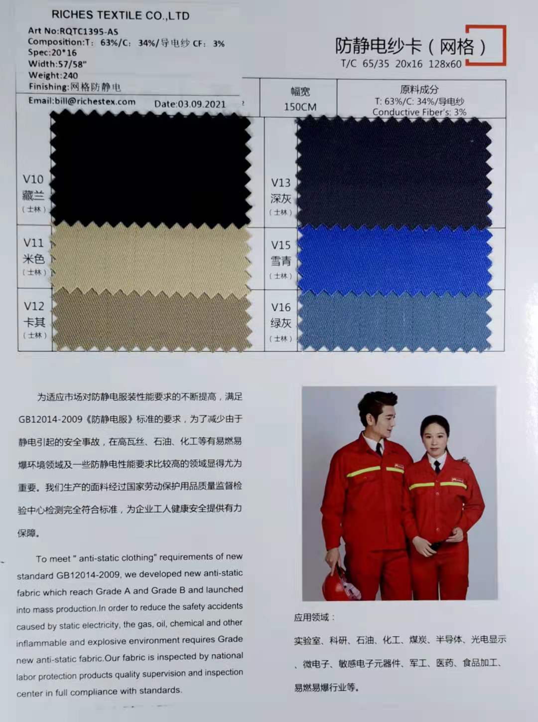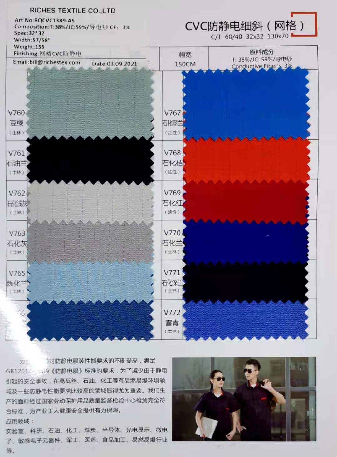 ?CVC防靜電細(xì)斜面料(網(wǎng)格)38%T*59%JC*導(dǎo)電紗3% 155克面料